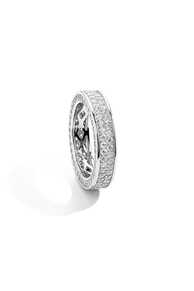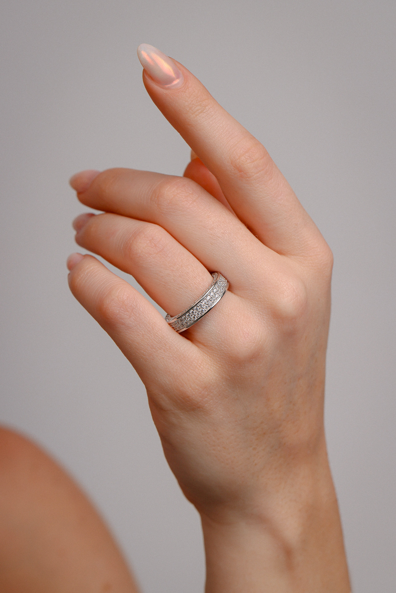 Seu design envolve delicadas fileiras de microzircônias cravejadas, criando um efeito de luz impressionante que destaca a beleza do acabamento e da estrutura anatômica. Um anel com presença marcante, sem perder a leveza e a feminilidade.
