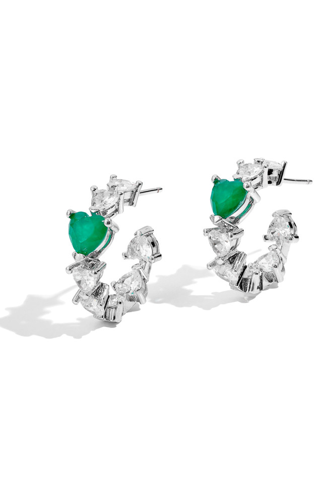 Este brinco é uma joia em forma de semijoia. Sua estrutura cuidadosamente cravejada com zircônias em cortes diversos — que refletem a luz com intensidade única — é finalizada por uma pedra tipo esmeralda em formato de coração, que rouba a cena com seu verde vibrante e acabamento refinado. A base recebe banho de Prata 925, garantindo brilho duradouro e um visual elegante que transita entre o clássico e o moderno.
