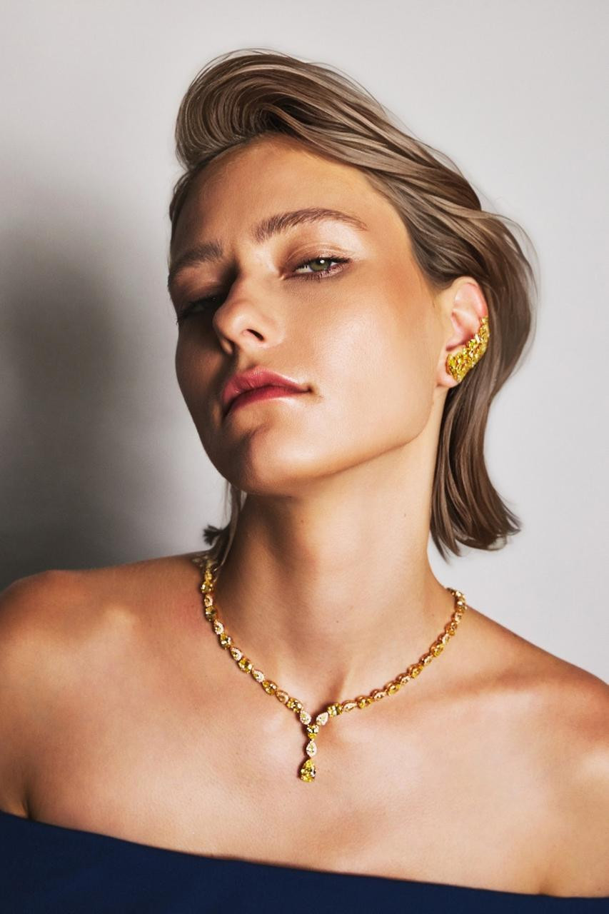 Use o Brinco Luciana Yellow com penteados presos ou cabelos atrás da orelha para evidenciar sua estrutura imponente e valorizar ainda mais seu brilho dourado.
