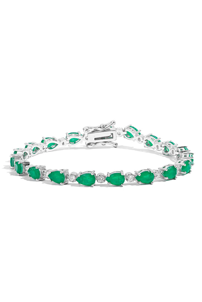Seu design é composto por pedras tipo esmeralda em lapidação gota, intercaladas com zircônias cristal que acentuam ainda mais a elegância da composição. O verde intenso traz vida ao visual, iluminando o pulso com charme atemporal e toque de modernidade.