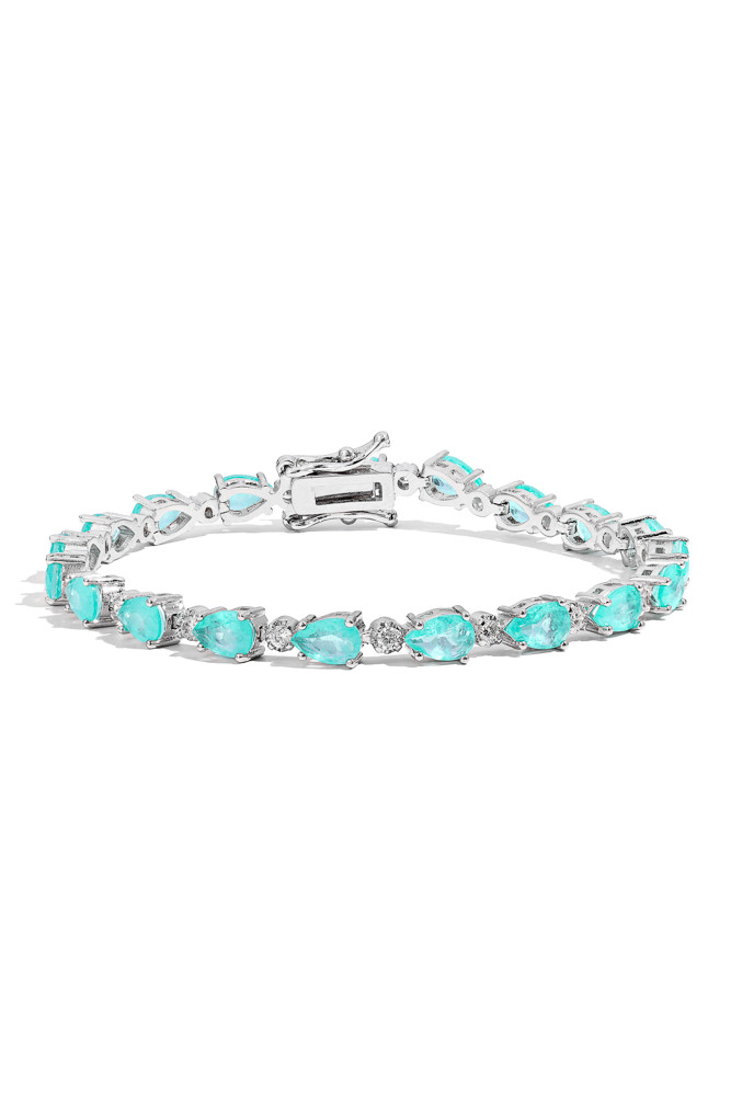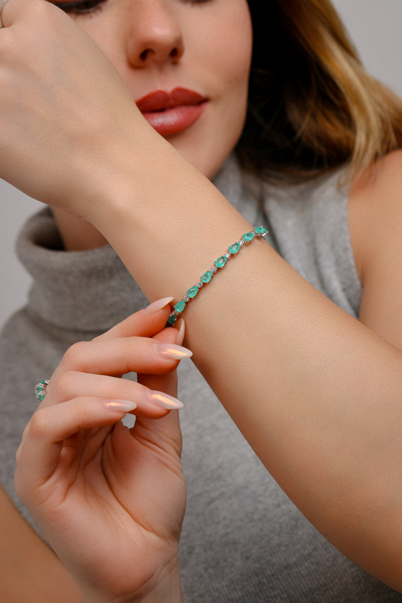 Uma joia que traduz elegância com leveza e brilho. A pulseira gotas traz o charme inconfundível da pedra tipo colombiana em lapidações delicadas em formato de gota — perfeita para composições sofisticadas ou para ser protagonista no pulso. Cada pedra é intercalada por pequenos pontos de luz, criando um jogo sutil entre o brilho e a cor.